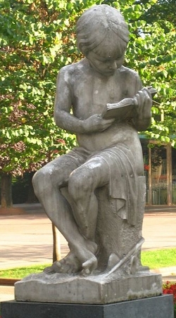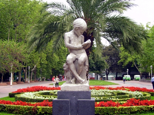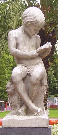 Hace dos veranos paseando por Bilbao descubrí una escultura preciosa que me cautivó por la aparente sencillez del motivo, la fotografié y después investigué sobre fecha y autor. Hoy he unido ambas cosas. Se trata de la obra Leyendo de Joaquín Lucarini de 1932, que, como veis, muestra a una niña que abandona sus juguetes, muñeca? a su derecha y diábolo a su izquierda, para sumergirse en la lectura.